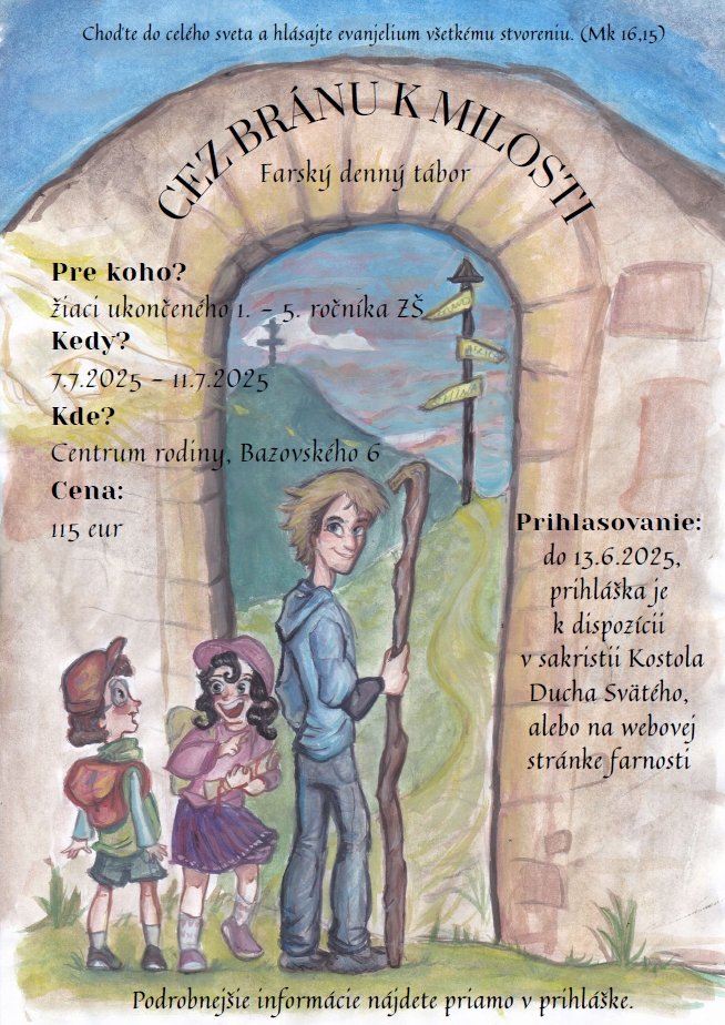 Pozývame deti a mladých našej farnosti na Farský denný tábor pre žiakov 1. – 5. ročníka. Tábor bude od 7. do 11. júla v priestoroch Centra rodiny, Bazovského 6. Prihlasovanie detí bude do 13. júna alebo naplnenia kapacity. Cena je 115 €. Bližšie informácie sú na plagáte nižšie a v rámci prihlášky.